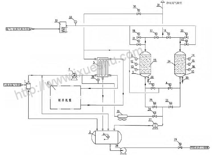 1 - 凝液收集罐; 2 - 氣液分離罐; 3 - 液位變送器; 4 - 風機; 5 - 冷箱; 6 - 制冷機組; 7 - 吸附罐進口閥A; 8 - 吸附罐進口閥B; 9 - 吸附罐A; 10 - 吸附罐B; 11 - 溫度變送器A; 12 - 溫度變送器B; 13 - 溫度變送器C; 14 - 溫度變送器D; 15 - 溫度變送器E; 16 - 溫度變送器F; 17 - 吸附罐出口閥A; 18- 吸附罐出口閥B; 19 - 吸附罐破真空閥A; 20 - 吸附罐破真空閥B; 21 - 吹掃氣進口閥A; 22 - 吹掃氣進口閥B; 23 - 吸附劑床層A; 24 - 吸附劑床層B; 25 - 真空脫附閥A; 26 - 真空脫附閥B; 27 - 真空泵; 28 - 回液泵; 29 - 外輸液流量開關閥; 30 - 緊急放空閥; 31 - 排放筒; 32 - 加熱器; 33 - 熱氣體溫度變送器; 34 - 熱氣體脫附開關閥; 35 - 冷卻器、36 - 冷卻溫度變送器