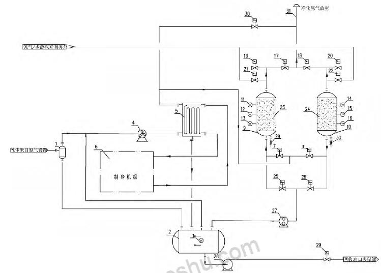 1 - 凝液收集罐; 2 - 氣液分離罐; 3 - 液位變送器; 4 - 風機; 5 - 冷箱; 6 - 制冷機組; 7 - 吸附罐進口閥A; 8 - 吸附罐進口閥B; 9 - 吸附罐A; 10 - 吸附罐B; 11 - 溫度變送器A; 12 - 溫度變送器B; 13 - 溫度變送器C; 14 - 溫度變送器D; 15 - 溫度變送器E; 16 - 溫度變送器F; 17 - 吸附罐出口閥A; 18- 吸附罐出口閥B; 19 - 吸附罐破真空閥A; 20 - 吸附罐破真空閥B; 21 - 吹掃氣進口閥A; 22 - 吹掃氣進口閥B; 23 - 吸附劑床層A; 24 - 吸附劑床層B; 25 - 真空脫附閥A; 26 - 真空脫附閥B; 27 - 真空泵; 28 - 回液泵; 29 - 外輸液流量開關閥;30 - 緊急放空閥; 31 - 排放筒